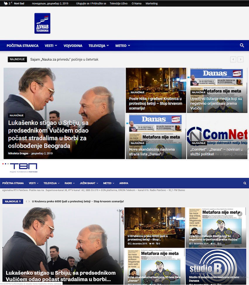 Sajtovi TV Dunav i RTV Pančevo pokazuju isti sadržaj (foto: snimak ekrana)
